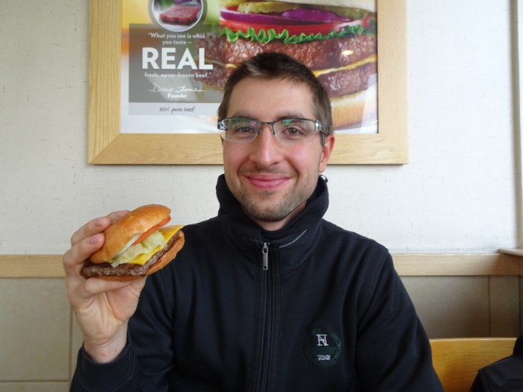 Burgery byly díky slevě za polovic, takže chutnali o to líp. Každej jsme si dali jeden velkej burger, kterej měl dvojitý maso, slaninu a sýr, byl trošku sušší ale jinak fajn. Vzhledem k našemu nedostatečnýmu nasycení jsme se ale rozhodli, že si napůl dáme ještě jeden burger za polovic – nějakej menší, se salátkem a drezingem, takže byl šťanvatější. Dohromady bych řekl, že jídlo za tu cenu nebylo tak špatný, vlastně nás ten větší burger stál míň jak BigMac v Čechách. Já bych samozřejmě potřeboval větší porce, ale to je můj stálej problém. Připočtěme k jídlu ovšem takovou američtější atmosféru, kterou fastfood nabízel a vlastně to byl docela dobrej zážitek.