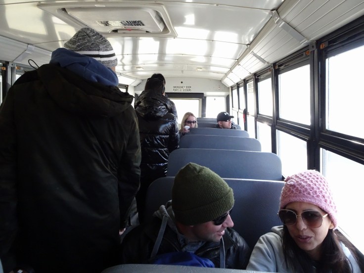 Už z auta jsme mohli v dálce před náma obdivovat zasněžený vrcholky hor, který se postupně přibližovaly a rostly všude kolem nás. První zastávka byla u jezera s výhledem na cementárnu. Druhá byla až u turistickýho centra, bohužel ovšem po naší neúspěšný smyčce nahoru okolo všech (už plnejch) parkovišť, odkud jsme byli otočeni a navráceni zpět. V centru jsme dostali mapku a info, kam máme přeparkovat ke stanovišti autobusů, který nás vyvezou a dovezou až k jezeru. Autobusy jezdily co 15 minut a za jejich neschopnost zorganizovat lepší parkovací prostory jsme museli platit za svezení $4. Jako pozitivum ovšem hodnotim fakt, že jsme jeli echtovnim školnim autobusem, takže víme, v jaký herce se tady vozí děti.