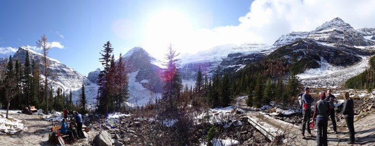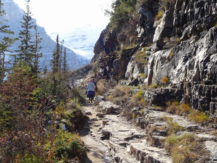 U jezera jsme nakonec byli asi ve 12 a byli jsme limitovaní pouze faktem, že poslední autobus dolů pojede v 17:40. Nicméně pět hodin bylo víc než dost na to, abychom ušli okruh, kterej jsme s T*** objevili a chtěli ho projít – šlo o cestu kolem jezera Louis, kousek do kopečka k Tea Housu a pak zpátky okolo jezera Agnes. Celý to mělo bejt asi 15km, převýšení tak 400m, takže pohoda. Jenže to jsme tak úplně nevěděli, že Lucy strašně ráda fotí a naše tempo tedy nebylo ani zdaleka průměrný (měřeno vůči obvyklý rychlosti naší chůze, oproti ostatním návštěvníkům jsme byli možná trochu nadprůměrný). Okolo jezera vedla příjemná pěšinka a vzhledem k tomu, že svítilo sluníčko, tak jsme za chvíli sundavali vrstvy a šli skoro v tričku.