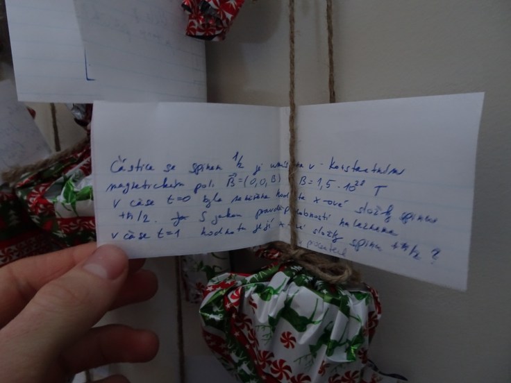Klávesnice se vrací do rukou Patrika, který chce dodat jen pár drobností. T*** pro mě vyrobila krásnej adventní kalendář z laskomin a abychom nepopřeli naši historii, číslíčka na kalendáři jsou řešením příkladů z matiky, fyziky a chemie různorodejch obtížností. Kromě jednoduchých úloh typu „Kolik adventních kalendáří T*** P*** vyrobila?“ přes vyčíslování chemický reakce nebo řešení diferenciální rovnice bude asi pomyslným hřebíčkem do rakve obtížnosti příklad z kvantový mechaniky, kvůli kterýmu si budu muset osvěžit Hamiltonián nabité částice v elektromagnetickym poli.